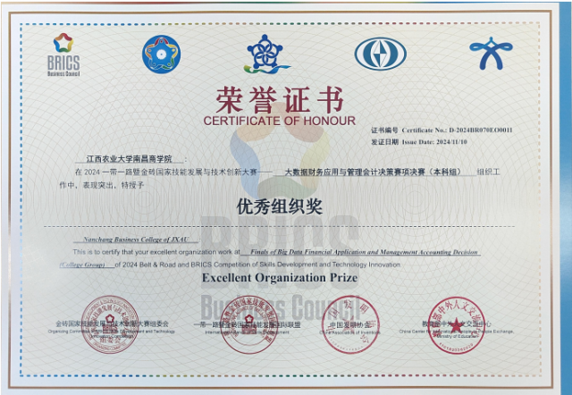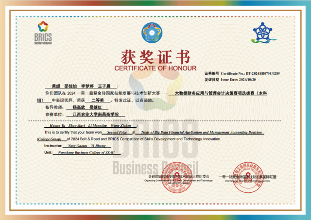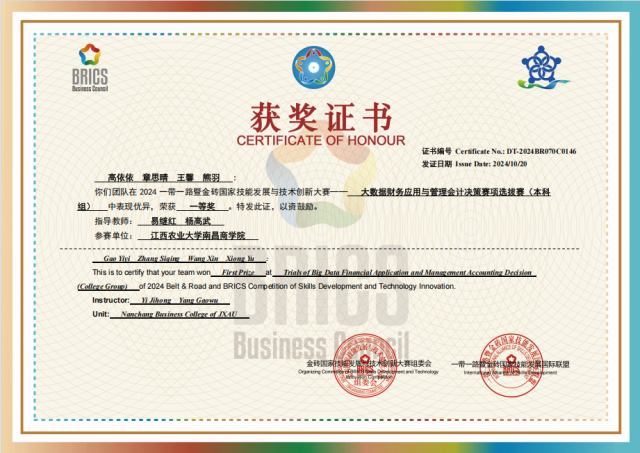 近期,2024年“一带一路”暨金砖大赛之大数据财务应用与管理会计决策竞赛本科组(东区)获奖名单公布,财会系教师易继红、杨高武指导的参赛队伍在此次比赛中斩获佳绩。其中,高依依、章思晴、王馨、熊羽组成的参赛队伍获得东区一等奖,黄煜、邵佳怡、李梦婷、王子晨组成的参赛队伍获得东区二等奖,江西农业大学南昌商学院被授予“优秀组织奖”。