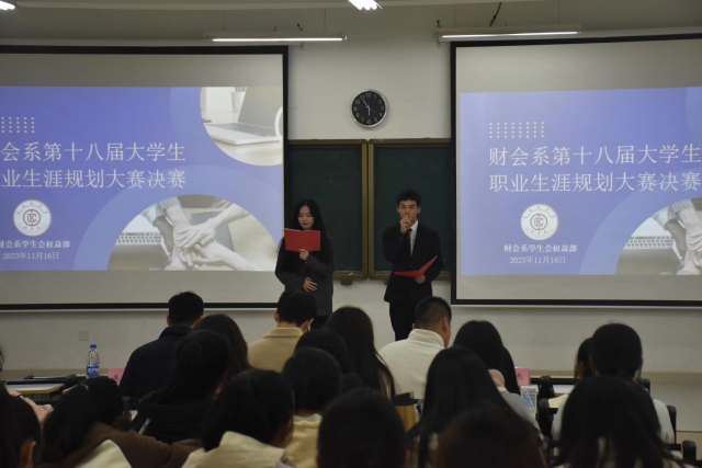 为了积极引导财会系学子规划好未来职业生涯,11月16日晚上,财会系于笃行楼AW101举办财会系第十八届大学生职业生涯规划大赛。招生就业处王少华、财会系张浩杰、朱雅鸿担任此次大赛评委。经过初赛选拔,共有6支参赛队伍进入决赛。