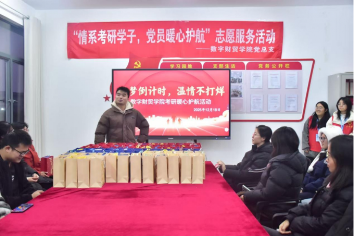 12月18日,数字财贸学院党总支在学生社区组织开展了“情系考研学子,党员暖心护航”志愿服务活动,通过具体举措为即将参加硕士研究生招生考试的学子提供支持与鼓励。
