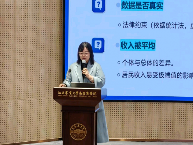 刘敏结合自身丰富的统计执法监督经验,围绕统计法律法规体系,通过实务案例深入解读依法统计的核心要义与实践规范,剖析常见风险点与规范流程。她紧扣数字财贸专业特点,重点阐述了统计知识在财务数据核算、贸易市场分析等领域的应用,促进法治教育与专业学习相融合。